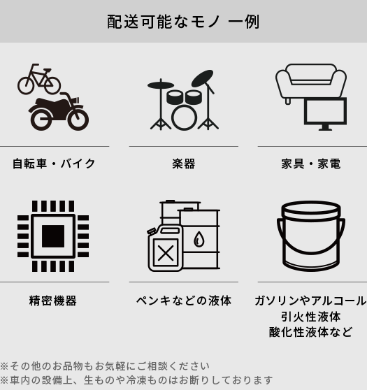 家電や楽器はもちろん、バイクや自転車など、大きくて配送に困るものを代理でお届けいたします。